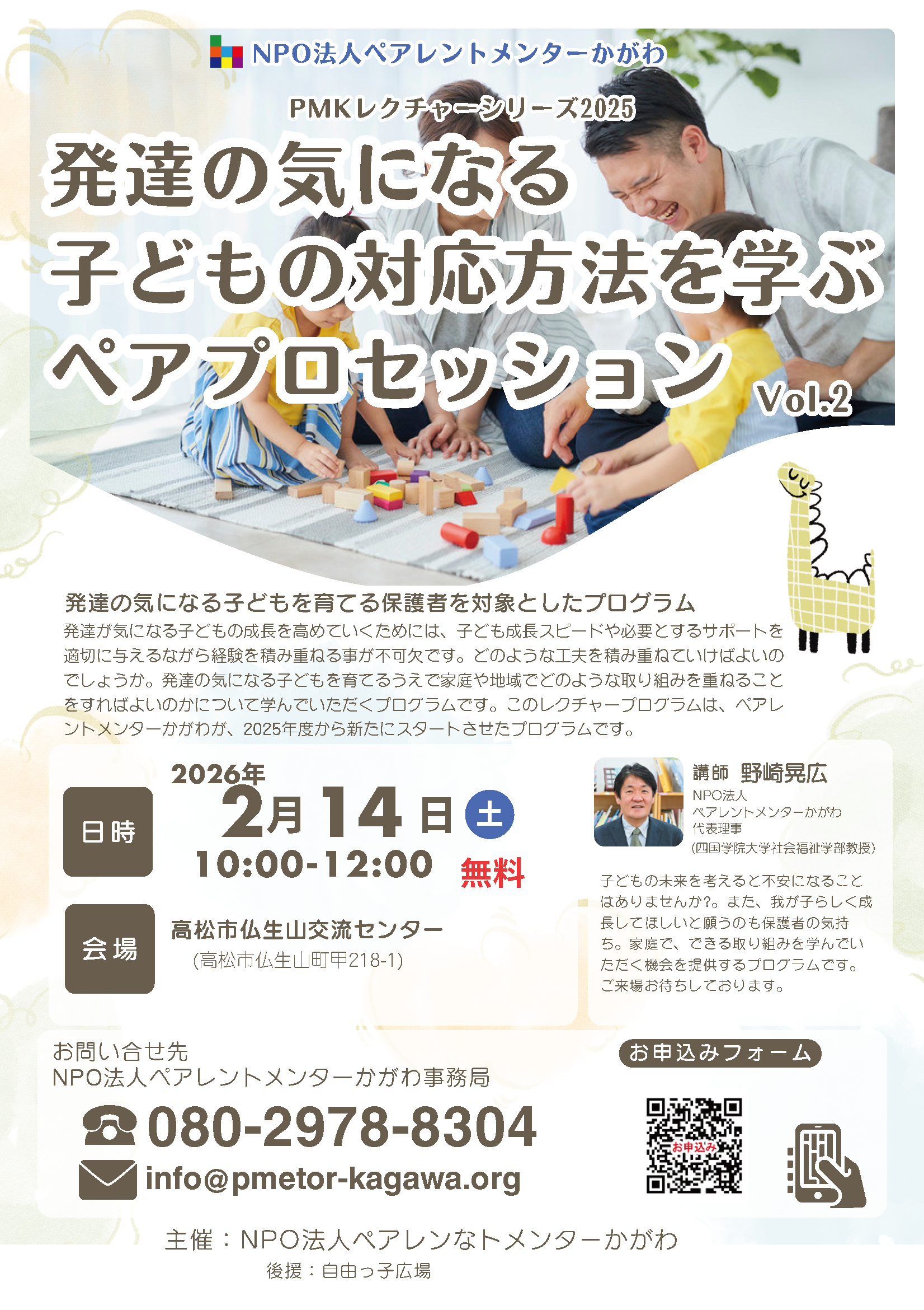 このプログラムは、保護者を対象としていますが、子どもに関わる専門職者の方の参加も大歓迎いたします。第1回目は、小豆地区で開催です。当日は、当会代表理事 野崎晃広による具体的な対応を学ぶ講演を行い、現状の子育て対応よりもステップアップすることを目指して我が子への対応方法を学んでいただきます。