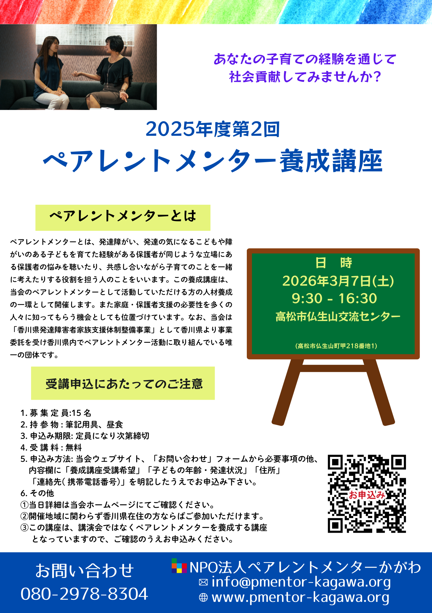 ペアレントメンターとは、発達障がいなどがある子どもを育てる親が、その経験を生かして同じ立場にある親の孤立化を防ぐ等の目的から親同士の支えを担う人として認知され始めました。当会のペアレントメンター活動は、かがわ方式として、発達障がいだけに限らずに、知的障がい、肢体不自由、精神障がい等の多様な障がい種と、子どもの年齢も乳幼児期からはじまり成人期までの子どもを持つ保護者が抱く悩みや不安などを持つ保護者を支えようと活動しています。