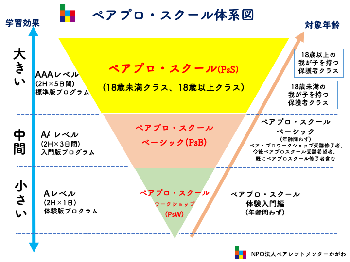 2023年度より新たに開設されるペアプロ・スクールベーシック(PsB)は、入門版プログラムとなります。このプログラムの参加対象者は、①ペアプロ・スクールワークショップ(PsW)の参加された方、②過去にペアプロ・スクール受講された方の振り返り学習として、③ペアプロスクールを欠席等して修了していない方の復習として、④来年度まで待てない!! 受講したい方、これらペアプロスクールの学びの内容に触れている方を対象としています。我が子と共に成長しようと考えている保護者が、今後、ペアプロ・スクール標準版プログラム(PsS)の受講までの間、学びの橋渡しを想定したプログラム内容として新たに開発したものです。学習効果は、ワークショップ(PsW)よりは大きくなりますが、標準版プログラム(PsS)からしますと学習内容は小さく、入門版プログラムとなります。より大きな効果を得たい方は、ペアプロ・スクールベーシック(PsB)を受講した後、標準版プログラム(PsS)の受講をオススメします。または、ペアプロスクール(PsS)を受講してください。