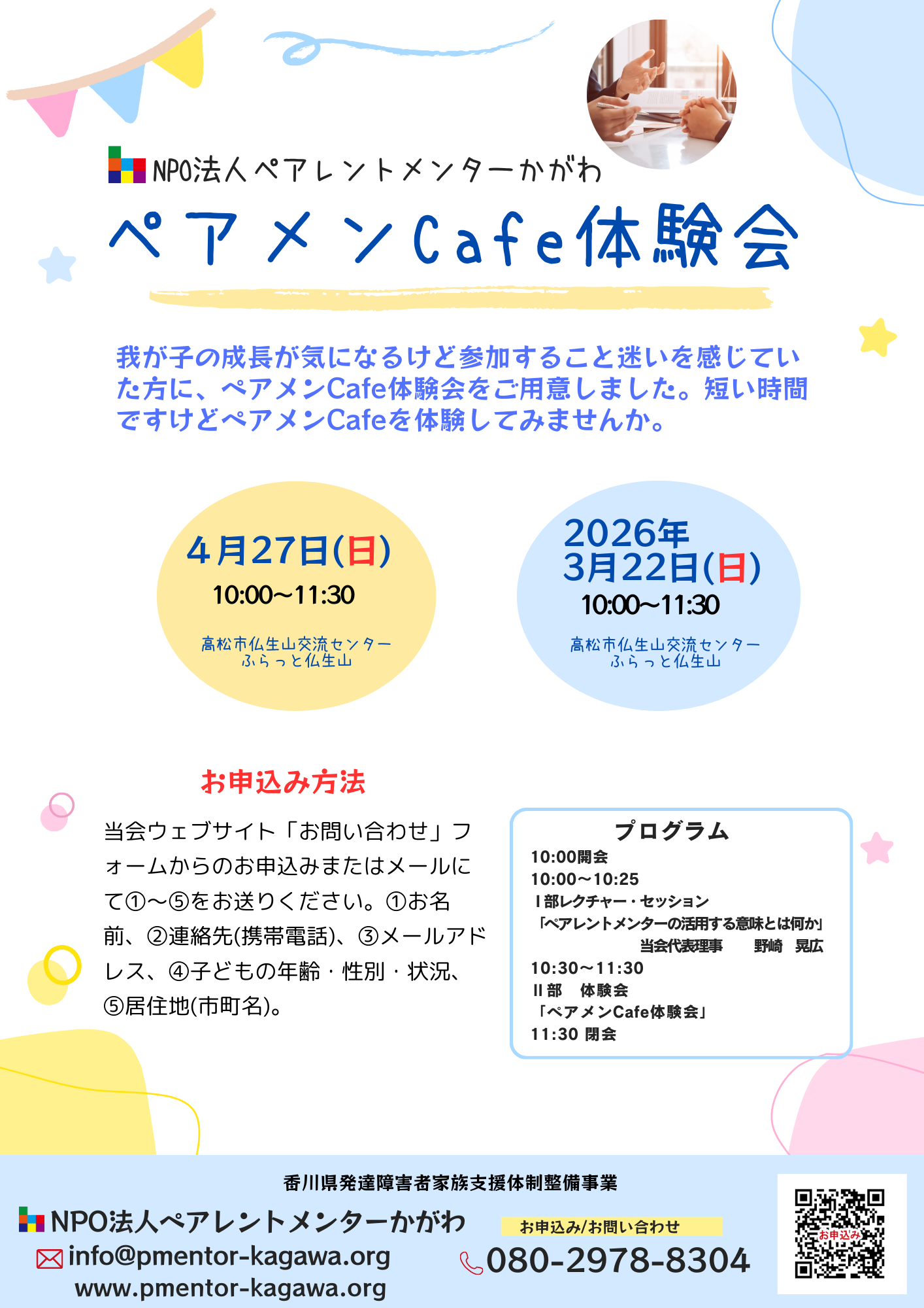 この体験会は、ペアメンCafeやペアレントメンターについて噂は耳にするけど、いきなりペアメンCafeに踏み出せない、そんなご家庭に向けてご用意した体験会です。時間も通常のペアメンCafeからするとかなり短い時間。体験会では、当会よりペアレントメンターによる支援活動について、代表理事による簡単なミニ・レクチャーの後、参加者とペアレントメンターで、語り合い相談を体験していただきます。状況によっては、代表理事を交えた発達相談もできるかもしれません。ご夫婦での参加も大歓迎、当会ではパパメンターも相談活動に取り組んでいます。