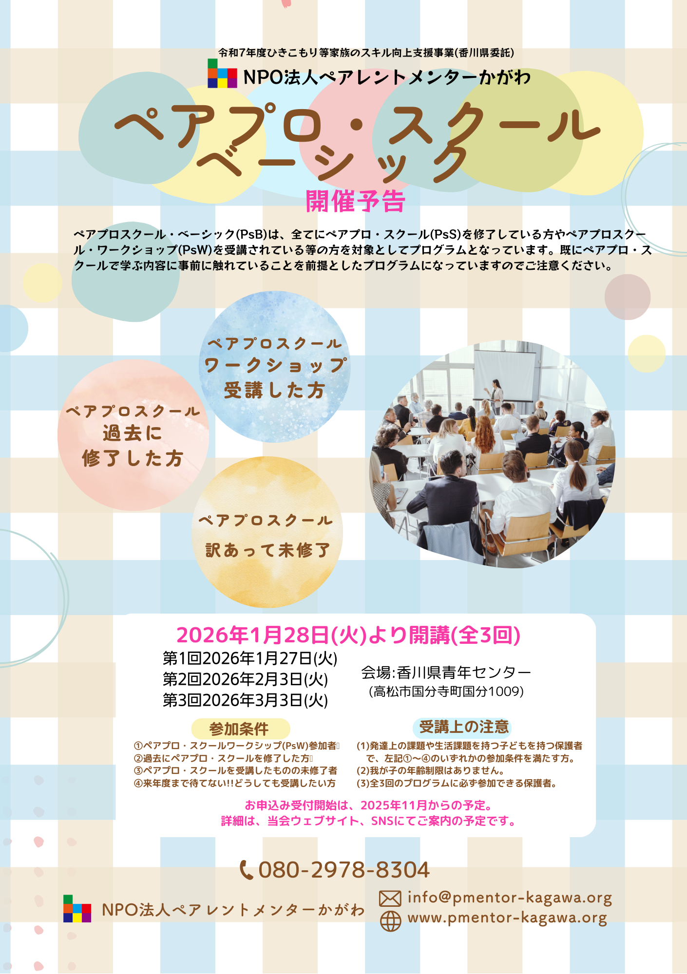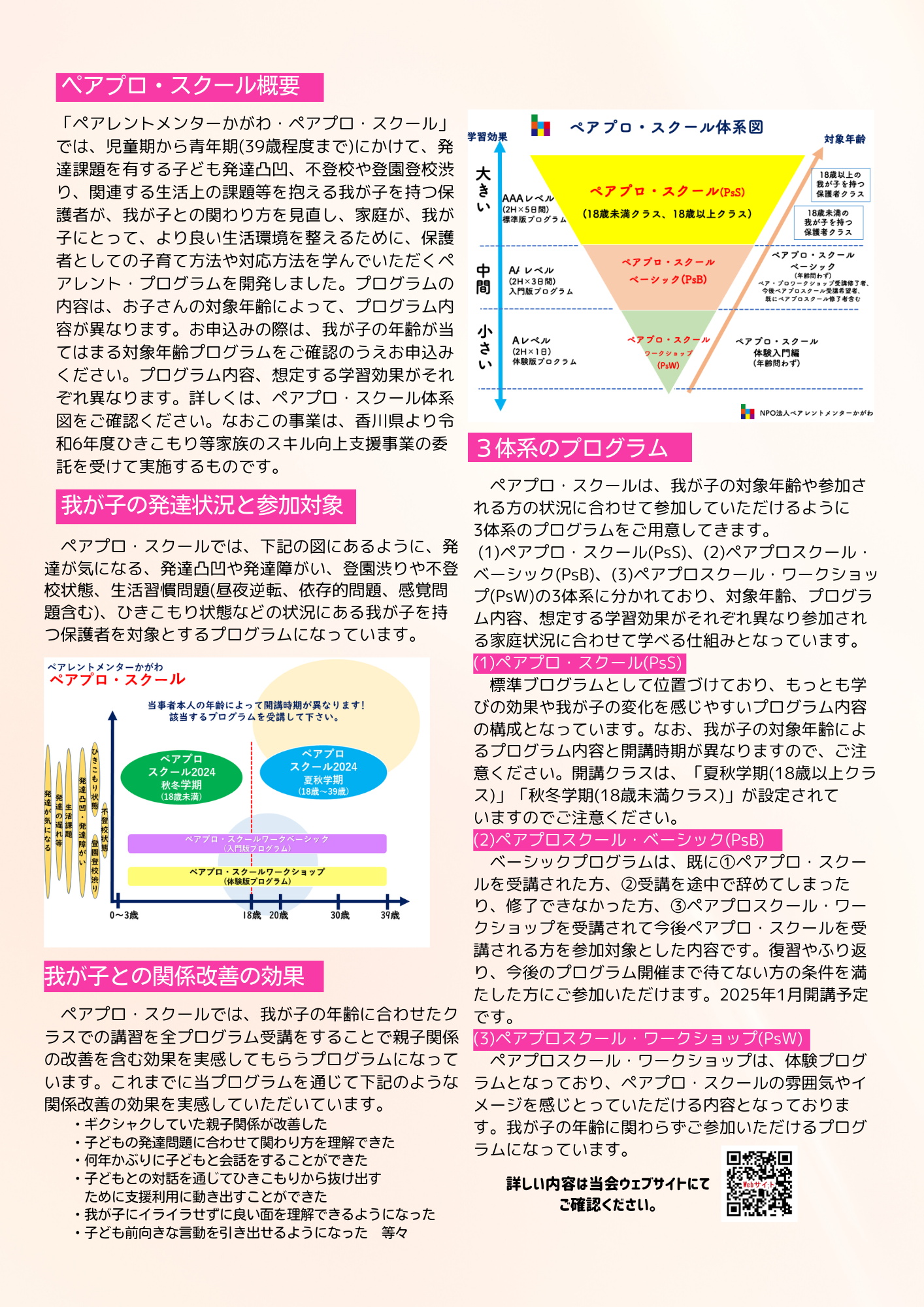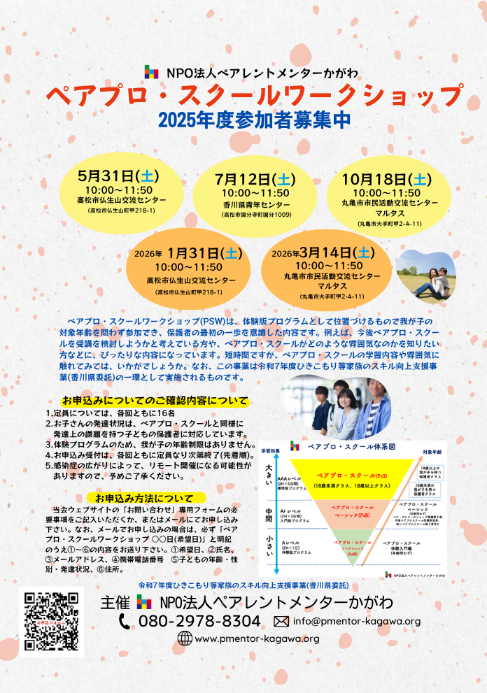 当会が開発したペアレント・プログラムをペアプロ・スクールと呼びます。ペアプロ・スクールは、ペアプロ・スクール(PsS)、ペアプロスクール・ベーシック(PsB)、ペアプロスクール・ワークショップ(PsW)の3体系に分かれ、対象年齢、プログラム内容、想定する学習効果がそれぞれ異なります。2023年度からは、新たに、ペアプロスクール・ベーシック(PsB)が開設され、ペアプロ・スクール体系図にあるように3体系のプログラムにアップデートして、皆さんのご事情に応じてご参加いただけるプログラムとなりました。昨年度は、お申込み受付直後に、全日程のプログラムが定員に達するなど、多くの保護者の皆さまに、ペアプロ・スクールにご参加いただいております。この事業は、香川県より「令和8年度ひきこもり等家族対応スキル向上支援事業」の委託を受け実施するものです。