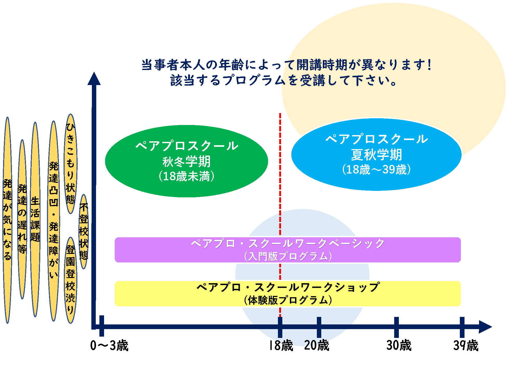 標準版プログラムとして位置づけられるペアプロ・スクール(PsS)は、①18歳未満の子どもを持つ保護者向けプログラム、②18歳以上の子どもを持つ保護者向けプログラム、2つの年齢別クラスで開講され、各年齢クラスに合わせた生活課題、発達課題を踏まえて学んでいただきます。そのため、必ず我が子の年齢に合わせた年齢クラスでの受講をお願い致します。また、ペアプロ・スクールのプログラムのうち、最も学習効果が高いプログラムとなっています。具体的には、発達の気になる子ども、発達凸凹、不登校やひきこもりなどの子どもを持つ保護者が、これまでの子育て対応を振り返り、もっと良い方法、もっと楽に我が子と過ごせるヒントを学び、我が子との親子関係や家族関係をプラスに作用する対応方法を実践できるように学ぶ内容になっています。なお、全日程に参加していただくことで学習効果が得られる内容になっていますので、部分受講のご参加は認めておりません。